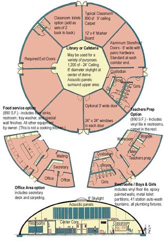 Gyms & School Pods << Previous | Back to Article | Next >> Acedemic Pod The exterior one-piece concrete shell will withstand natures violent extremes far better than any conventional construction. The roof covering is warranted for 10 years, but can extended to 20 years with the optional roof coating. Interior partitions are gypsum board over noncombustible heavy gauge metal studs. The center room is open to the dome vaulted ceiling. 6,647 S.F. - 92 Dome |