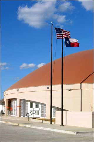 Designed by Monolithic Architect Rick Crandall and built with a 12' stemwall, this Monolithic Dome measures 124'x25' with a total height of 37-feet. It features seating for 720, a full-size basketball court, four locker rooms, a front foyer concession, and bathrooms. The beautifully stuccoed exterior includes a synthetic glass-block entryway and an eye-catching, copper-colored roof. |